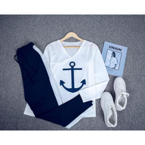Get ready to sail through your day in this trendy nautical print two-piece lounge set. The front of the ultra-comfy v-neck white top showcases an oversized navy blue anchor. The coordinating navy blue joggers feature a classic drawstring, tapered leg, and white contrast side stripe.
